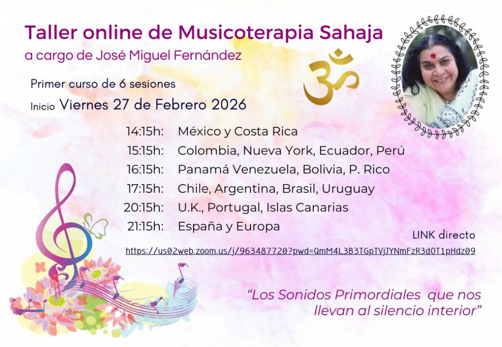El próximo viernes 27 de febrero a las 21:15h de la hora peninsular, os invitamos al inicio de los nuevos Talleres de Musicoterapia Sahaja online.